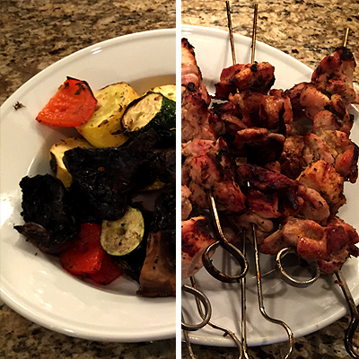 - Chop veggies into 1 – 1 1/2 inch chunks and thread onto their own skewer. Brush lightly with olive oil and reserved 1/4 cup marinade (not used for the raw meat). Grill until tender, turning and basting occasionally, approximately 10-15 minutes.