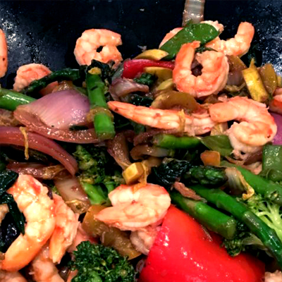 - Add shrimp to vegetable mix and stir until veggies cooked and shrimp warm.
