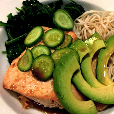 Salmon, Soba, Spinach, and Avocado Bowl